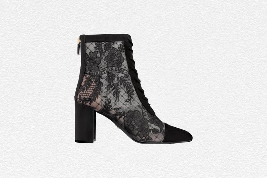 The Naughtily-D heeled ankle boot showcases streamlined, elegant lines. Playing with transparency, the mesh style is intricately embroidered with Dior’s black Roses motif.