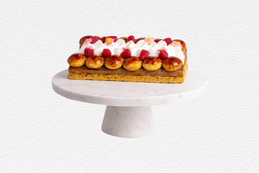 A classic French pâtisserie made with a crisp puff pastry base and caramel-glazed choux, filled with vanilla custard and light Chantilly cream. Finished with raspberry coulis and fresh berries for a bright, elegant flourish.