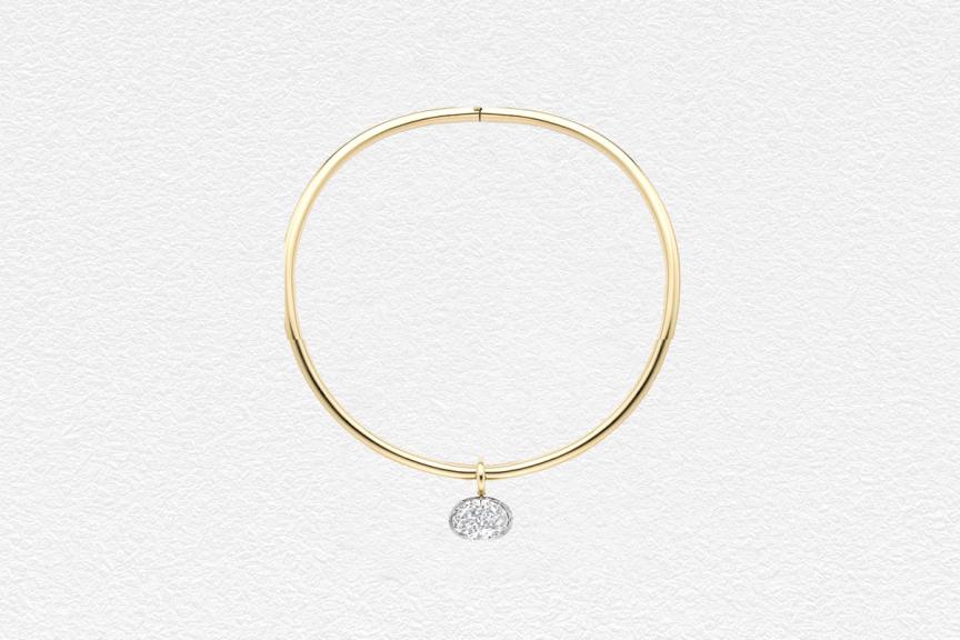 Jessica McCormack’s sculptural Oval Diamond Torque Necklace places a magnificent oval diamond at its centre, suspended from a delicate torque in 18k white and yellow gold. Available in a range of oval diamond sizes starting from six carats.