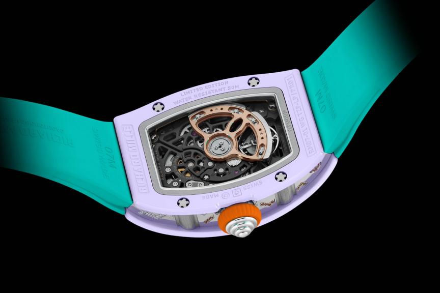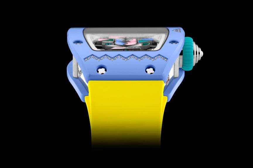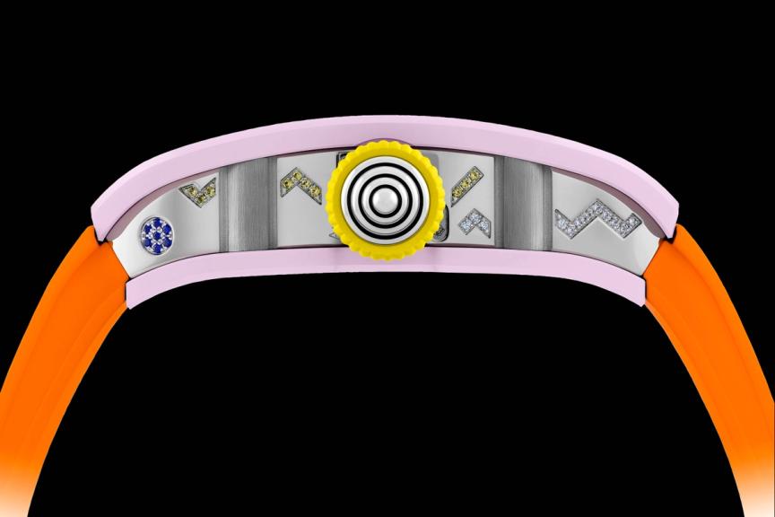The RM 07-01 Blush Pink combines diamonds with yellow and blue sapphires, while the RM 07-01 Powder Blue pairs diamonds with pink sapphires and tsavorites. Meanwhile, the RM 07-01 Lavender Pink reveals a vibrant interplay of diamonds, orange sapphires, and rubies.