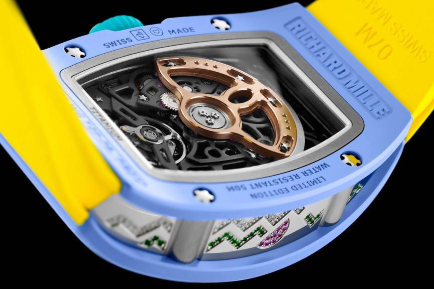 Now, Richard Mille may be young in tenure, but it leans into the defining trait of any twenty-something: unpredictability, with surprises revealing themselves when you least expect them. That idea plays out quite literally here. Tilt each model to the side and the caseback – sandwiching the case – unveils a further scattering of stones, an unexpected detail that glistens within every angle.